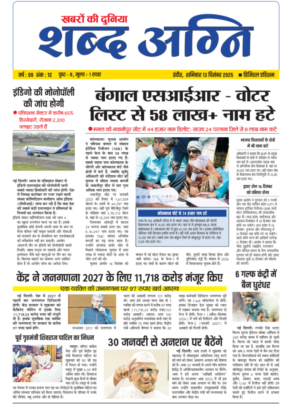 www.ShabdAgni.com भारत का एक निर्भीक, निष्पक्ष, विश्वसनीय समाचार पत्र एवं न्यूज चैनल पोर्टल है जो कि आपको सटीक खबरें प्रदान करने के लिए प्रतिबद्ध है हम आपको देश-विदेश, अपराध, राजनीतिक, सामाजिक, खेल स्वास्थ्य, धर्म, तकनीक, विज्ञान, मनोरंजन सहित अन्य महत्वपूर्ण एवं नवीनतम समाचार खबरों द्वारा प्रदान करते है