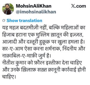 शब्द अग्नि / भोपाल : एमआईएम के प्रदेश अध्यक्ष मोहसिन अली खान ने सोशल मिडिया अकॉउंट एक्स पर बिहार के मुख्यमंत्री नितीश कुमार द्वारा मुस्लिम महिला का हिजाब खींचकर हटाने वाली हरकत पर कड़ा विरोध जताया है, ज्ञात हो कि एक आयोजन के दौरान मुस्लिम महिला डॉक्टर को पत्र देने के दौरान बिहार के मुख्यमंत्री नीतीश कुमार द्वारा महिला के चेहरे से हिजाब खींचने 5का मामला सामने आया था