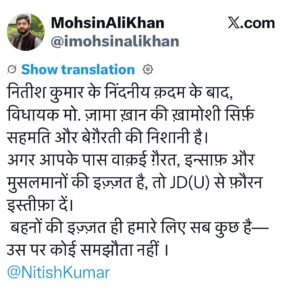 इसी के साथ मोहसिन अली खान ने जेडीयू विधायक को भीं आड़े हाथो लेते हुए अपने सोशल मिडिया अकॉउंट एक्स पर दिए अपने दूसरे वक्तव्य में लिखा है कि “नितीश कुमार के निंदनीय क़दम के बाद, विधायक मो. जामा ख़ान की ख़ामोशी सिर्फ़ सहमति और बेग़ैरती की निशानी है। अगर आपके पास वाक़ई ग़ैरत, इन्साफ़ और मुसलमानों की इज़्ज़त है, तो JD(U) से फ़ौरन इस्तीफ़ा दें।बहनों की इज़्ज़त ही हमारे लिए सब कुछ है— उस पर कोई समझौता नहीं “। ज्ञात हो कि एमआईएम प्रमुख और हैदराबाद से सांसद असदुद्दीन ओवेसी ने मोहसिन अली खान को अभी हल ही में कुछ दिन पहले ही मध्य प्रदेश एमआईएम कि कमान सौंपी है, मोहसिन अली खान की नियुक्ति के बाद से ही प्रदेश के सियासी गलियारों में हलचल साफ़ देखीं जा रही है,