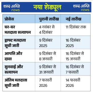 शब्द अग्नि/ यासिर पठान चुनाव आयोग ने 12 राज्यों और केंद्रशासित प्रदेशों में चल रहे स्पेशल इंटेंसिव रिविज़न (SIR) की समय सीमा बढ़ा दी है. आयोग ने अपने पूर्व आदेश को संशोधित करते हुए संशोधन प्रक्रिया की तारीखों में बदलाव का फैसला किया है. अब मतदाता सूची अपडेट करने के लिए नागरिकों को सात दिन अतिरिक्त मिलेंगे12 राज्यों में SIR अब 11 दिसंबर तक अपडेट किया जा सकता है. अब ड्राफ्ट रोल 16 दिसंबर को जारी होगा.
